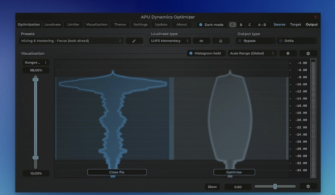 动态优化器允许您重塑音频文件的完整动态频谱。您可以选择“均匀”或“正态”分布,并可以将后者偏向分布的顶部或底部。这允许您以多种方式塑造音频的动态。优化器会获取此信息并使用它随着时间的推移对压缩/扩展比率进行许多微小的调整。这是您使用传统压缩器永远无法做到的事情。