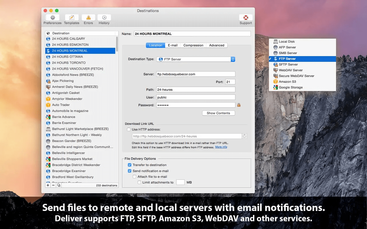 通过电子邮件发送通知通过 Internet 和本地网络发送文件。 该应用程序支持 FTP、SFTP、Amazon S3、WebDAV 和其他主要服务。 文件交付后,目标收件人会收到一封自动电子邮件通知,其中包含文件的下载链接。 Deliver 还可以在一段时间后自动从服务器上删除文件。