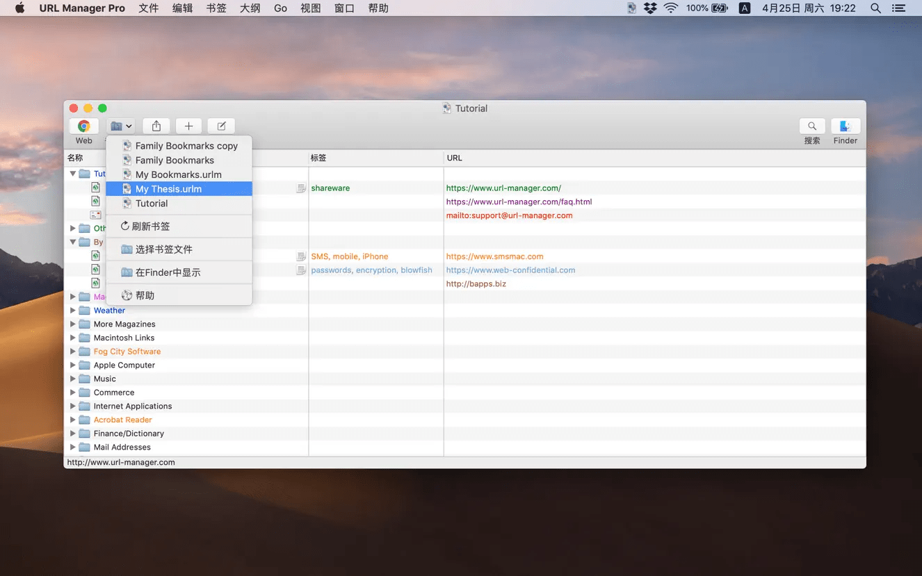 在 URL Manager Pro 主界面,可以通过鼠标拖动轻松管理和整理书签,可以为书签添加标签,备注,背景颜色。该软件还提供强大的搜索和查找重复书签功能。