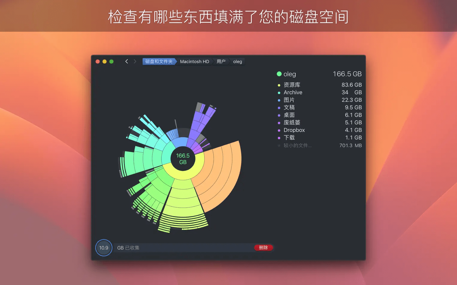 通过交互式的图形显示直观地查看磁盘的使用情况,帮助您发掘占用空间的垃圾文件,只要简单的拖拽操作就可以直接删除它们。