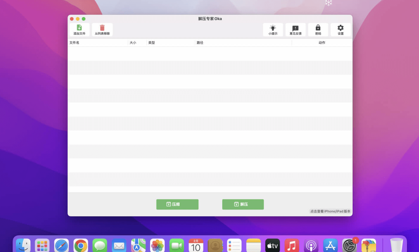 您可以将任何文件添加到列表中以进行压缩或解压。如果单击“压缩”按钮,解压大师可以一次性压缩列表中的所有选中的文件。如果单击“解压”按钮,解压专家 for Mac将自动解压文件。