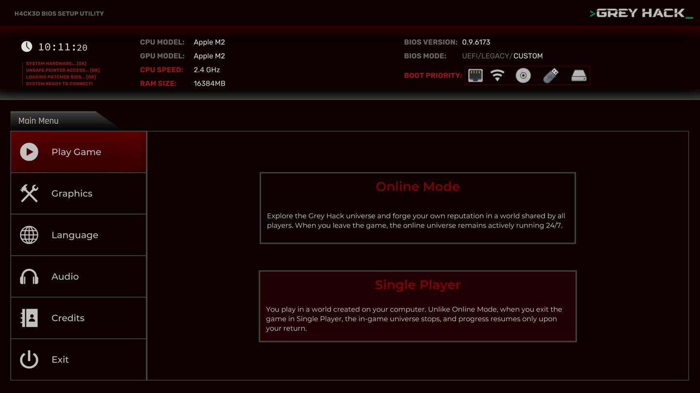 Grey Hack 旨在以多人模式游玩,利用始终在线宇宙的丰富环境,但该游戏也为那些倾向于独自游玩的玩家提供了单人模式。在单人模式下,你将在自己的计算机上创建的世界中进行游戏。与在线模式不同,当你退出单人模式时,游戏内宇宙会停止,进度仅在你返回时继续。