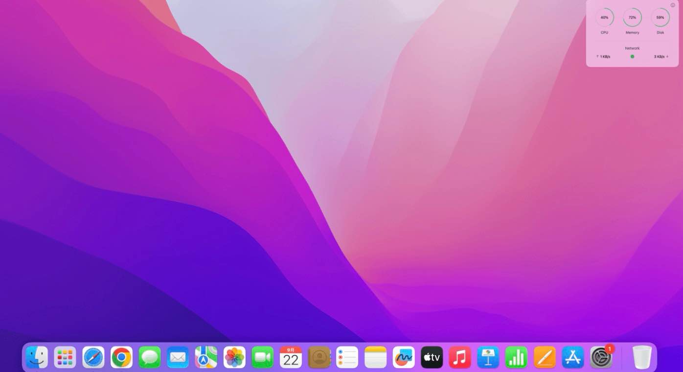 Monit for Mac 是一款轻量级的系统监控工具,它能将关键的硬件与性能数据直接集成到 macOS 的通知中心。只需从屏幕右侧滑出通知中心,即可实时查看 CPU 使用率、内存占用、磁盘空间、网络流量以及电池状态等核心信息。