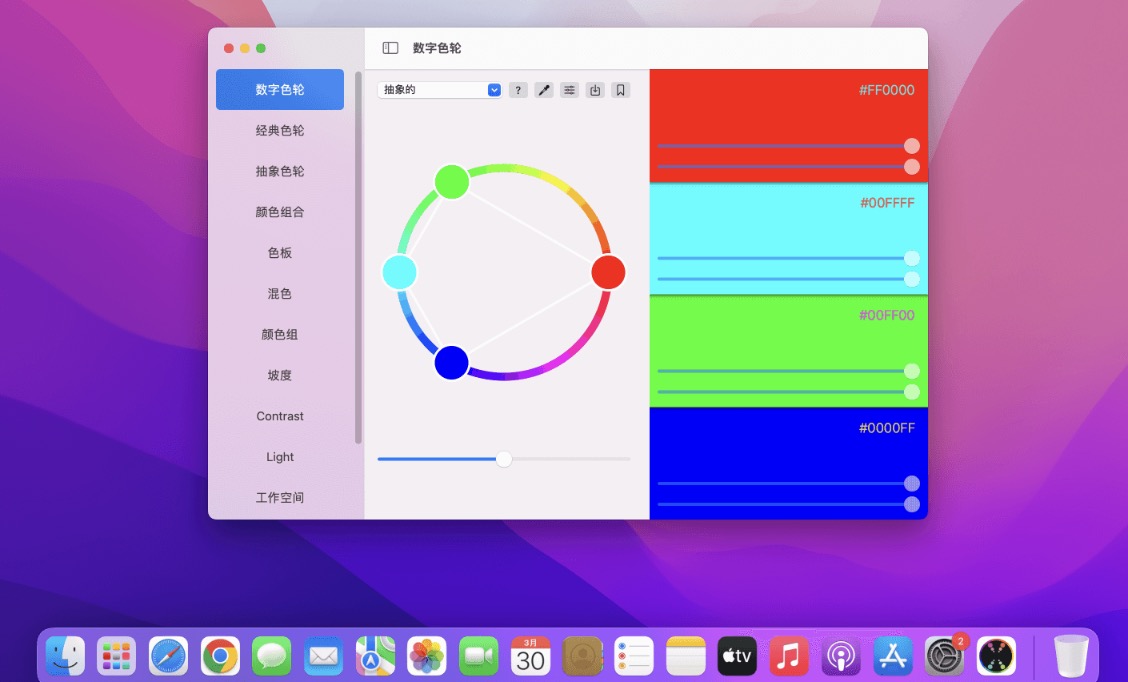 Color Wheel 是一款适用于 macOS 的色轮应用。通过 Color Wheel 可以帮助您快速的找到最匹配的颜色组合,设计师必备的工具之一!
