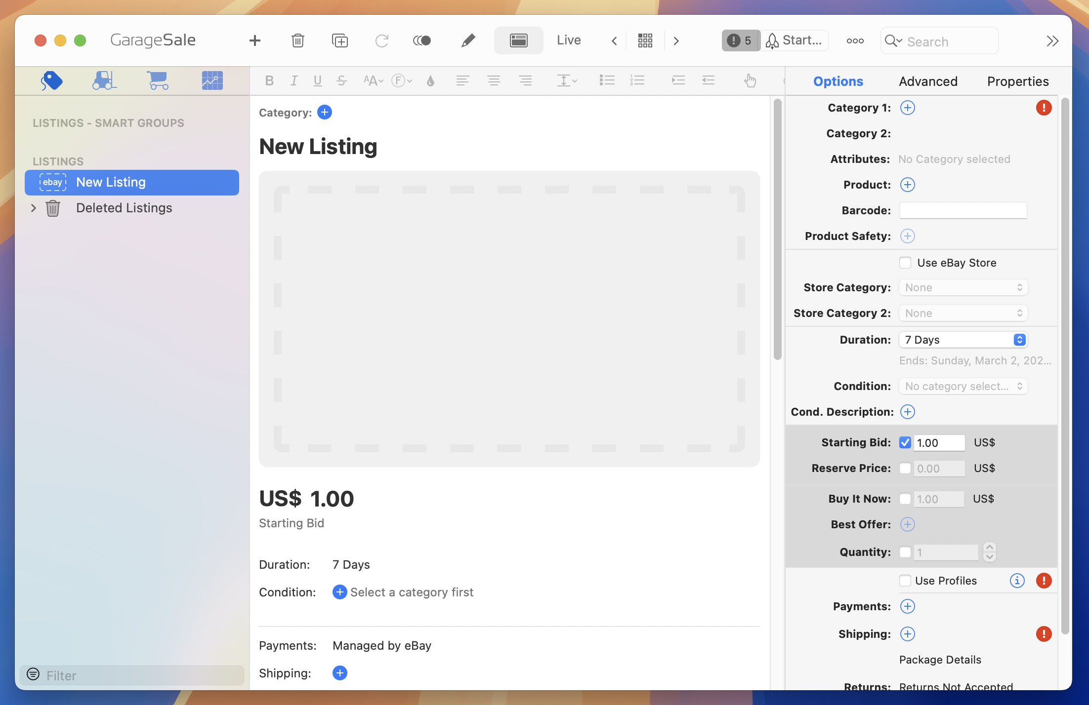 GarageSale for Mac 是一款专为 eBay 卖家打造的桌面端拍卖和商品管理软件。它为用户提供了一整套商品上架、库存跟踪、订单处理和数据统计工具,大幅简化了 eBay 卖家的运营流程。无论是个人卖家还是小型店铺,GarageSale 都能帮助用户高效地管理商品和交易。